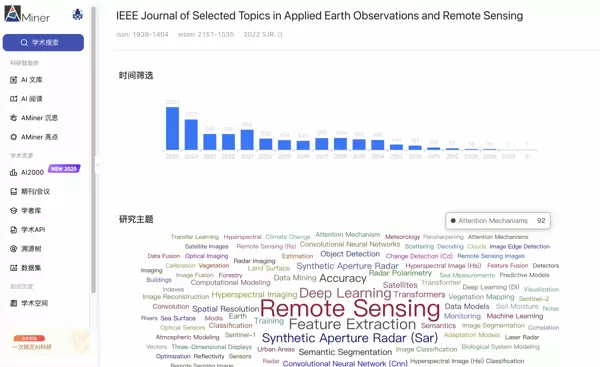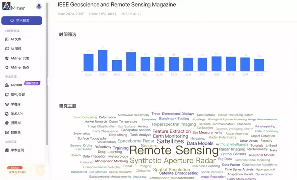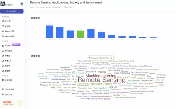 近年来,期刊发文量呈现显著增长趋势:2025年发表论文2027篇,2024年为1437篇,2023年达746篇,反映出遥感技术在环境监测、城市管理、气候变化等实际场景中的广泛应用需求持续上升,也凸显了其作为技术创新与产业落地桥梁的关键作用。