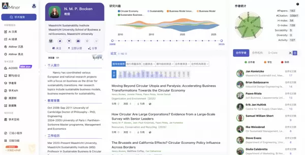 另一位核心高引作者是 N. M. P. Bocken,累计引用高达22388次,发表论文45篇。她的研究集中于可持续消费与生产模式、循环经济中的商业模式创新等领域。她所主导的系列研究《Global Rice Multi-Class Segmentation Dataset (riceseg): A Comprehensive and Diverse High-Resolution RGB-Annotated Images for the Development and Benchmarking of Rice Segmentation Algorithms》(可通过 AMiner 检索:https://www.aminer.cn/pub/67773d25ae8580e7ffb5a040/?f=fwh_am_v1)深入探讨了公民能源合作社成员对“循环太阳能商业模式”的认知与态度,为推动太阳能产业的社会参与式治理及循环经济发展提供了实证依据。