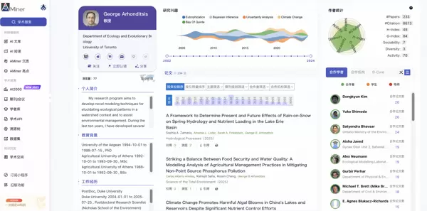 George Arhonditsis 是生态信息学期刊的核心高产作者,累计发表论文36篇,被引424次。他的研究主要集中于淡水生态系统的信息监测与模型构建,长期为湖泊、河流等水体生态系统的信息学研究提供理论与方法支持。其代表作《An Ensemble Modeling Framework to Elucidate the Regulatory Factors of Chlorophyll-a Concentrations in the Nanji Wetland Waters of Poyang Lake》(可通过AMiner检索:https://www.aminer.cn/pub/66a59afd01d2a3fbfcce1d66/?f=fwh_am_v1)采用随机森林与广义加性模型相结合的集成建模框架,识别出鄱阳湖南矶湿地水中叶绿素-a浓度的关键调控因素,并建立了可用于实时预测的模型系统。
