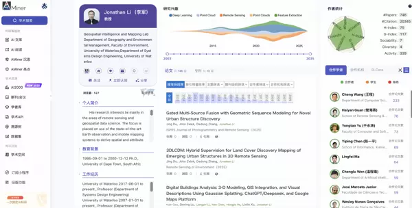 Liangpei Zhang(张良培)是遥感变化检测与城市遥感应用领域的领军学者之一,累计发表论文75篇,总引用数达6032次。其研究聚焦于遥感图像的变化检测及城市智能分析,在深度学习驱动下的遥感变化识别算法、城市要素自动提取等方面取得多项高影响力成果,显著推动了遥感在城市可持续发展与灾害应急响应中的深入应用。