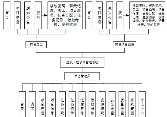 系统主要面向管理员和项目经理两类用户,提供以下核心功能: - 员工信息管理:支持员工数据的录入、修改、查询与删除; - 项目负责人管理:实现项目领导的合理指派与调整; - 项目基本信息维护:统一管理项目的名称、地点、工期、预算等参数; - 任务分配与执行记录:明确任务责任到人,跟踪任务完成情况; - 实时进度监控:可视化展示各项目阶段进展; - 绩效考核机制:依据工作成果进行量化评估; - 资源调配功能:统筹人力、材料、设备等资源配置; - 安全与质量检查:设置巡检计划并记录问题整改情况; - 系统参数与权限配置:统一管理用户角色、菜单权限及基础设置。