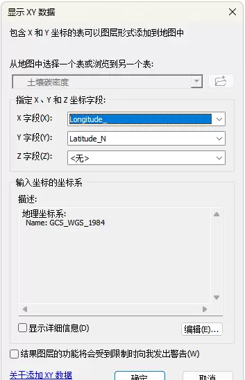 设置细节:将X字段指定为经度(Longitude),Y字段指定为纬度(Latitude)。由于当前数据采用的是经纬度表示法,因此坐标系应选择对应的地理坐标系(Geographic Coordinate System),以保证点位位置准确无误。