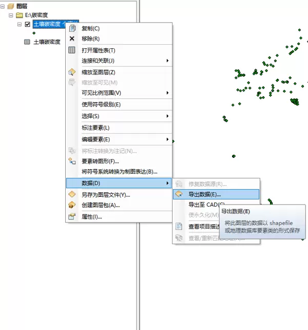 执行工具:在已生成的点图层上点击右键,进入“数据”菜单后选择“导出数据”功能。