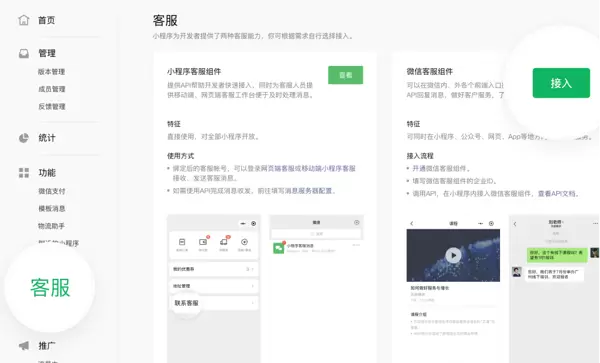 6、通过调用「在小程序中打开微信客服」接口,将复制的客服链接集成至小程序,实现客服功能的接入。
