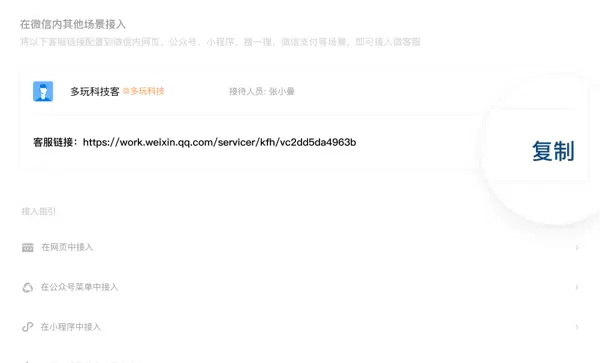 5、从客服账号列表中选择用于小程序用户咨询接待的服务账号,找到其专属客服链接并复制。