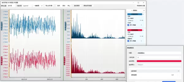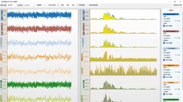 Ketusoft软件通过并列布局实现时域与频域信息的同步展示:左侧区域显示原始或滤波后的时域波形,右侧则呈现对应的频谱图。用户可在同一界面内添加多个通道线,便于比较不同信号或不同处理方式下的结果差异。当前版本支持限幅滤波、递推平均滤波、中值滤波、中值平均滤波、一阶低通滤波以及一阶卡尔曼滤波等多种常用滤波方法,能够有效抑制高频干扰和突发性噪声,提高数据的稳定性和可靠性。