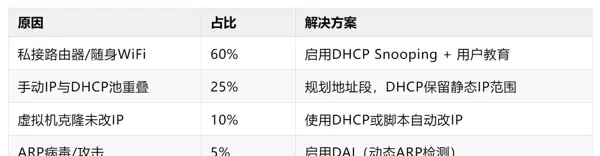 事实上,90%的IP冲突都源于人为操作失误或配置疏漏,而大多数网络工程师(约80%)仅停留在清ARP缓存、修改IP地址的层面,从未真正堵住源头。