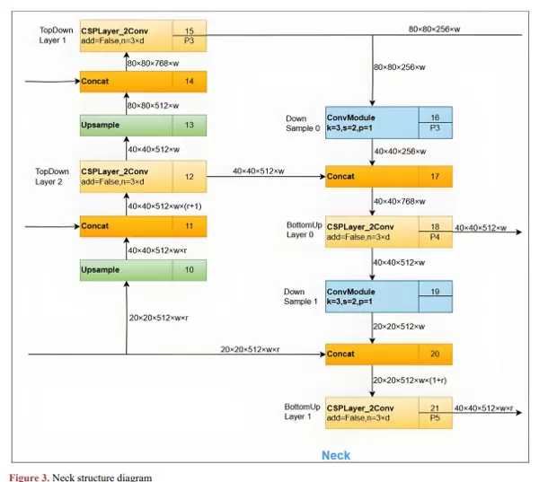 2) 颈部网络位于骨干网络与检测头部之间,承担着多尺度特征融合的关键任务。本系统采用改进型PAN-FPN结构变体,通过自下而上与自上而下的双向路径聚合机制,有效整合来自不同层级的特征图信息,使浅层细节特征与深层语义特征得以互补。此外,集成SPPF模块以在多个感受野范围内聚合上下文信息,进一步增强模型对小目标的感知能力。网络中还可能引入深度可分离卷积、残差连接等优化设计,在保证检测精度的同时兼顾推理速度,并缓解深层网络中的梯度消失问题。该结构显著提升了在车间环境中对小型或远距离目标的检测准确性,如图3所示。