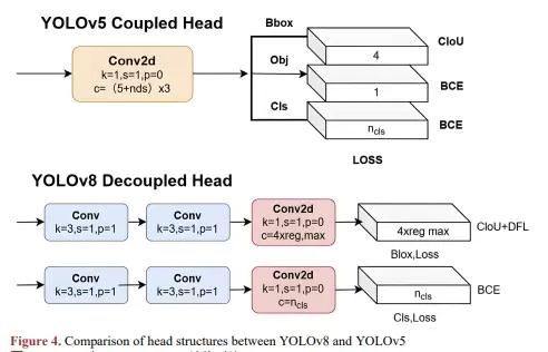 3) 检测头部是YOLOv8模型的最后一级处理单元,负责接收来自颈部网络输出的多尺度特征图,并据此生成目标的类别概率分布与边界框坐标预测结果。其结构设计直接影响最终检测性能,如图4所示。