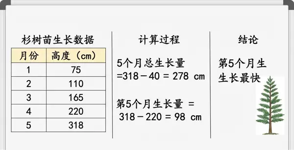 根据杉树苗生长数据(初始高度40cm,第5个月达到318cm),生成集“原始数据表+分步计算过程+最终结论”于一体的图示材料,适用于小学课堂教学。