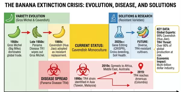 "text": "生成香蕉灭绝危机时间线图,包含1950年代大米七香蕉灭绝、当前华蕉单一栽培现状、巴拿马病TR4扩散路径、抗病品种研究方向,标注关键时间节点与数据(如全球99%出口香蕉为华蕉)"