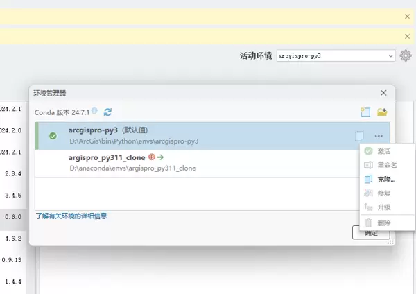 进入 ArcGIS Pro 的设置页面 → 包管理器,可以看到系统自带的 Python 环境信息:arcpy