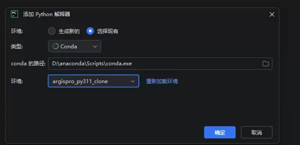 在弹出窗口中指定新的环境名称和存储路径。例如,可将其克隆至系统的 Conda 环境目录下(注意:ArcGIS Pro 自带的 Conda 仅供其自身使用,不应与其混淆):