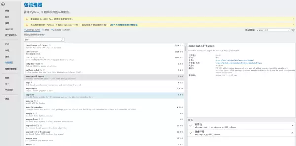 1. 在包管理器界面,点击当前活动环境右侧的“设置”图标;