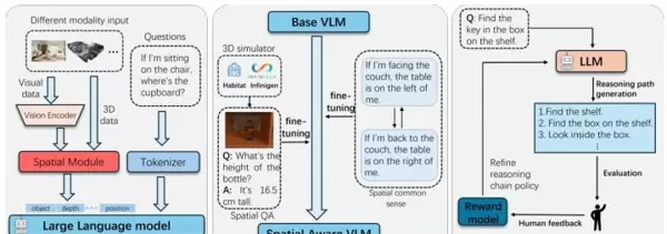 在此基础上,研究者进一步拓展至多模态领域,发展出视觉-语言模型(VLMs),将视觉编码器与大语言模型结合,试图打通感知与语言之间的鸿沟。然而,在人类智能中至关重要的空间认知能力——即对三维世界中物体位置关系的理解与推演能力——仍然是当前模型的重大短板。