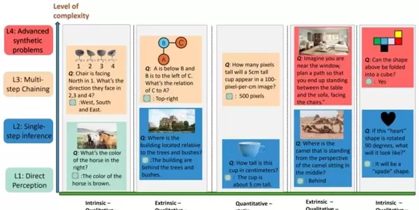 图 5 展示了认知分类与推理复杂度层级之间的映射关系:横轴代表五种核心认知任务类型,纵轴表示四级推理难度层次。该图清晰揭示了不同任务在认知维度与复杂度上的关联性。例如,在“外在 - 定性 - 静态”类任务中,Level 3 要求模型整合如“A 在 B 下方”和“B 在 C 左侧”这类信息,进一步推导出“A 与 C 的空间关系”。