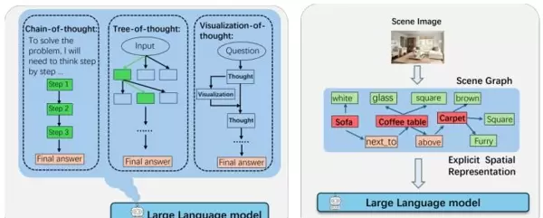 可视化思维链(VoT):要求模型生成ASCII艺术图或符号化图形表示中间状态,适用于导航和物体操作等空间任务;