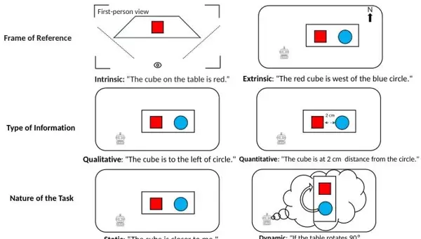 参考系用于定义物体的位置、朝向以及相互之间的关系。根据参照基准的不同,可分为内在参考系与外在参考系:前者依据物体自身的结构或方向进行描述,强调物体本体属性;后者则依赖于场景中其他物体或整体环境特征来定位目标。