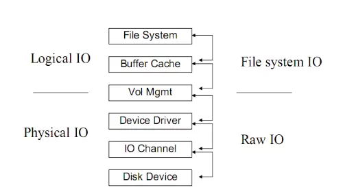 典型的IO系统可分为三个主要层次:文件系统、卷管理(VM)以及底层的磁盘存储设备。其结构如下: