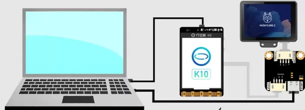 首先,使用一条USB数据线将电脑与行空板K10连接,用于程序上传与调试。接着,利用一根4Pin白色硅胶线将行空板K10与HUSKYLENS 2进行通信对接。由于HUSKYLENS 2对供电要求较高,建议额外使用第二条USB数据线将其Type-C接口连接至独立电源(如USB电源适配器或电脑USB口),以确保稳定运行。