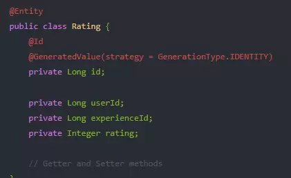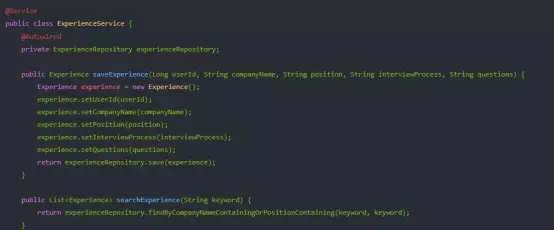 创建 Experience 实体用于映射数据库表结构,支持富文本内容存储与时间戳记录。