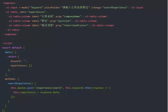 在 SearchExperience.vue 中封装搜索表单与结果展示区域,实现响应式交互体验。
