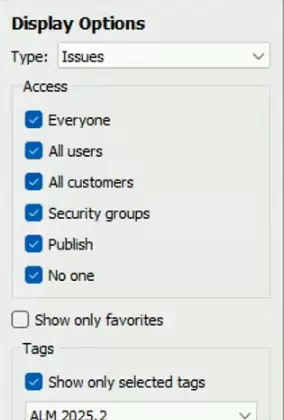 新版 Perforce ALM 提供了更智能的显示控制机制。用户可根据需要自定义筛选列表中展示的内容类型与标签类别,仅保留相关条目,避免海量无关项干扰工作界面。无论是哪种标签页,其显示偏好都会被系统自动保存。