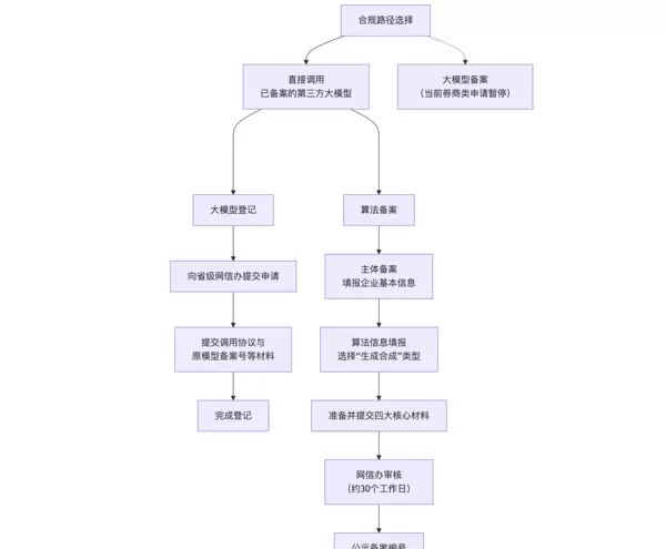 虽然券商专属大模型的备案通道暂未开放,但通过开展算法备案,或对调用第三方大模型的服务进行“大模型登记”,仍是当前可行的合规路径。下图清晰展示了两条路径的操作流程,便于企业定位自身发展阶段。