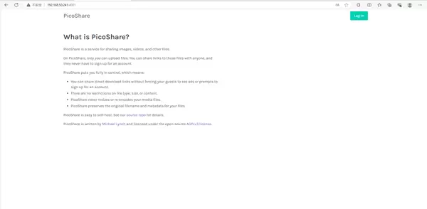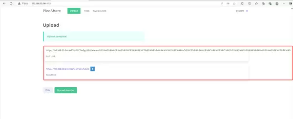 目前 PicoShare 已在本地成功运行,但仅限于局域网内部访问。若希望将文件分享链接对外发布,供公网用户访问,则需进一步配置公网可达地址。