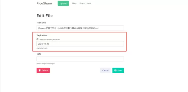 在实际使用中,PicoShare 的界面设计简洁直观,上传文件后可自定义分享链接的有效时间,提升了使用的灵活性与安全性。但需要注意的是,首次设置的登录密码务必牢记,否则将影响后续的访问体验。