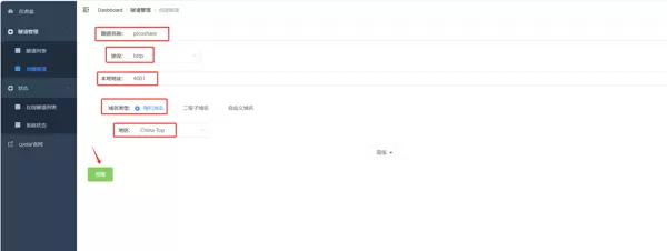 - 隧道名称:可自行定义,本示例中命名为 PicoShare,请确保不与已有隧道重名