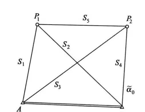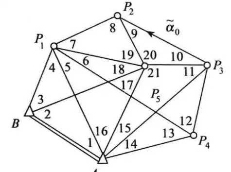 图为测边网,含两个已知点(提供4个坐标参数)和一个已知方位角,总计 Q = 5,属第二种情况。p = 4,故 t = 2×4 - 5 = 3。