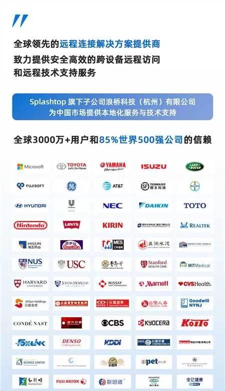在中国市场,Splashtop 通过全资子公司浪桥科技(杭州)有限公司提供本地化运营与技术支持,持续助力企业优化远程连接效率,强化安全管理能力。