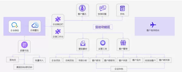 企业微信 作为统一接入窗口,客户由此进入服务体系;SCRM 支撑客户关系的深度运营与转化。