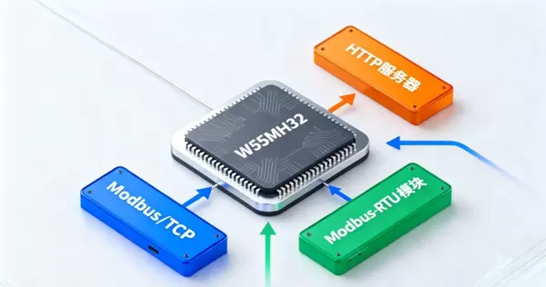 W55MH32 实现了串口通信(Modbus-RTU)与网络通信(Modbus/TCP)在硬件层面的完全解耦。得益于其内置的专用硬件 TCP/IP 协议栈引擎,网络协议处理任务由硬件直接完成,无需 CPU 干预。两种协议可并发运行,互不干扰,避免了丢包和通信阻塞现象。
