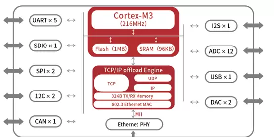 现代分布式I/O不再局限于简单的数据转发,而是要求具备一定的“边缘自治”能力,包括本地数据预处理、逻辑判断与闭环控制。W55MH32搭载216MHz Cortex-M3内核,配备丰富的原生I/O资源与扩展接口,为实现边缘侧智能化提供了坚实的算力与硬件支持。