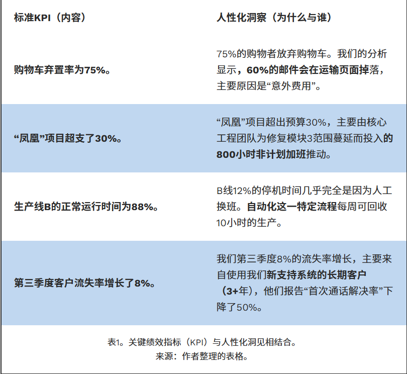 表1展示了上述主张。左侧显示基于原始KPI的简单评论,右侧则通过更广泛、更具人性化的洞察丰富了相同的指标。正如这一比较所示,原始KPI仅揭示症状,而人性化的洞察则揭示根本原因——如客户动机或流程障碍。这种清晰度更加可行,使团队能够超越单纯跟踪指标,开始解决扼杀成功的核心问题。