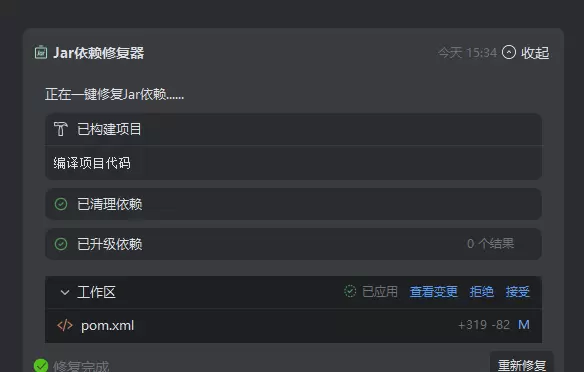 维护阶段:支持一键执行健康检查,全面识别依赖中的冲突、冗余及安全漏洞,并生成可操作的修复建议。实际测试表明,原本耗时数小时的手动梳理过程可缩短至几分钟内完成。