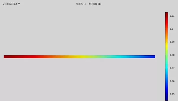 甲烷在催化剂作用下发生重整反应,生成一氧化碳和氢气。随着反应推进,电池阳极侧甲烷浓度逐步下降,尤其在催化活性区域浓度梯度更为显著;与此同时,产物气体(如H和CO)浓度相应上升。借助COMSOL仿真,可清晰呈现各组分在空间中的分布演化规律,揭示反应进程的空间差异性。
