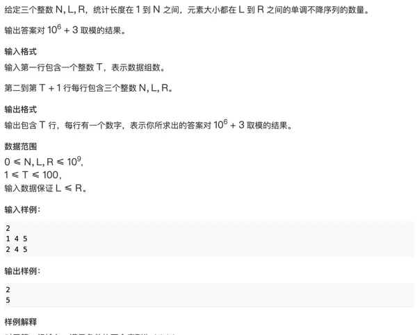 考虑枚举序列的长度 k(1 ≤ k ≤ N)。对于固定的 k,问题转化为:有多少个满足 a ≤ a ≤ … ≤ a 且每个 a ∈ [L, R] 的序列?