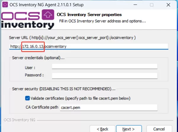 cd /usr/share/ocsinventory-reports/ocsreports/ sudo mv install.php install.php.bak接下来,部署客户端代理程序: 安装 OCS-Windows-Agent-2.11.0.1_x64 客户端时,除特定配置页面外,其余步骤可直接点击“下一步”完成安装。相关设置界面如下所示: