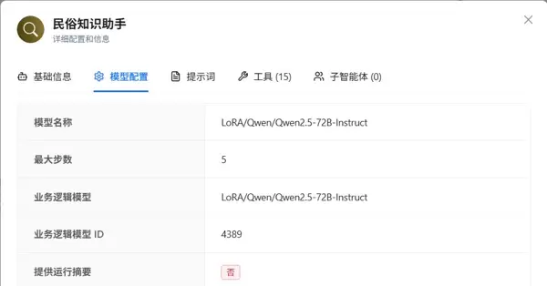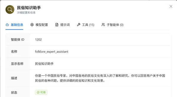 进入ModelEngine平台后,我们创建了一个ID为1202的智能体——“民俗知识助手”(内部标识:folklore_expert_assistant)。通过基础信息页面可见,系统已将其状态默认设置为“可用”,表明一旦配置完成即可立即投入运行。