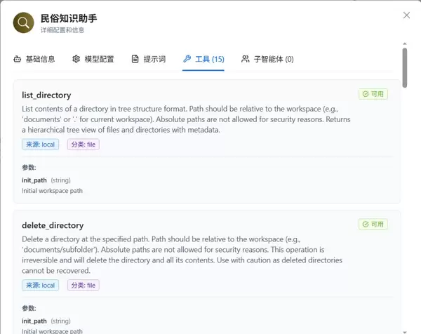 为增强智能体的功能完整性,ModelEngine为其配置了共计15个本地工具,全面支撑文件管理与知识查询等操作需求。