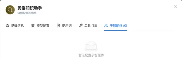在基础信息面板中,“子智能体 (0)”的显示表明当前采用的是单智能体架构。然而,该设计预留了多智能体协同接口,为后续扩展提供了可能。未来可根据业务发展需要,拆分为多个专业化子智能体,例如: