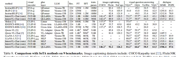 如表 9 所示,InternVL-Chat 在多模态对话任务中表现突出: