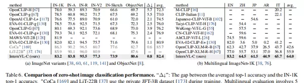 表 6a 显示,InternVL-C 在多个 ImageNet 变体上实现领先性能,尤其在面对分布偏移时表现出更强的鲁棒性。此外,在多语言图像分类任务中(表 6b),该模型在英语、中文、日语等五种语言上的平均准确率达到 64.0%,显著超越现有主流多语言模型。