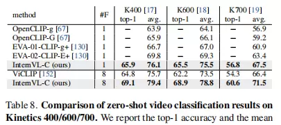 表 8 展示了 InternVL-C 在视频分类任务中的性能: