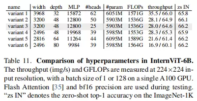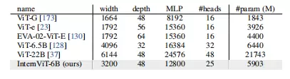 表 1 对比了 InternViT-6B 与其他主流视觉模型的架构特性。尽管其参数量远小于 ViT-22B,但凭借精细设计实现了更优的性能-效率权衡。
