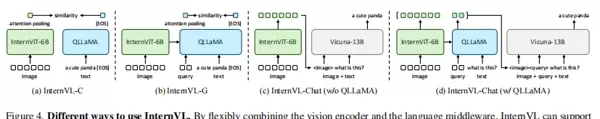 通过灵活组合视觉编码器与语言中间件,InternVL 可适配多种应用场景:- 视觉感知任务:直接将 InternViT-6B 作为骨干网络使用;
