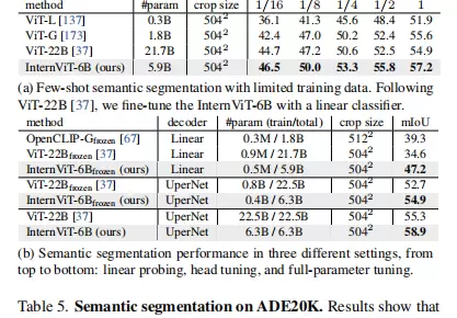 - 在线性探测设定下,InternViT-6B 实现 47.2 mIoU,比 ViT-22B 高出 12.6 mIoU
